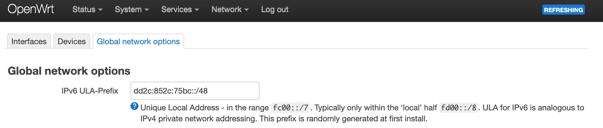 将 IPv6 的 ULA 前缀改为非 IANA 预留地址,如下图所示,最简单的方式是将开头的 fd 改为 dd