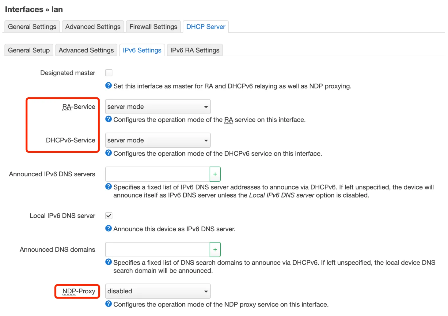 - 配置 LAN 接口的 DHCP,让路由器下的设备能被分配到 IPv6 地址