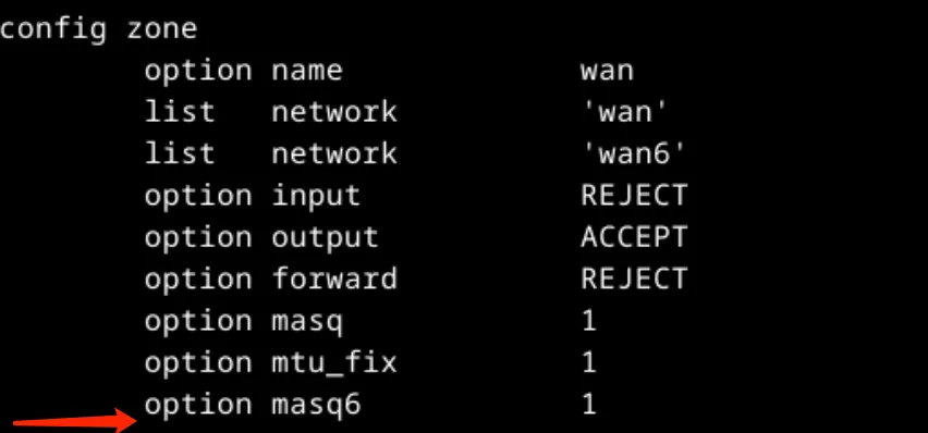 去 /etc/config/firewall 下的 config zone 加入一行配置即可启用 NAT6