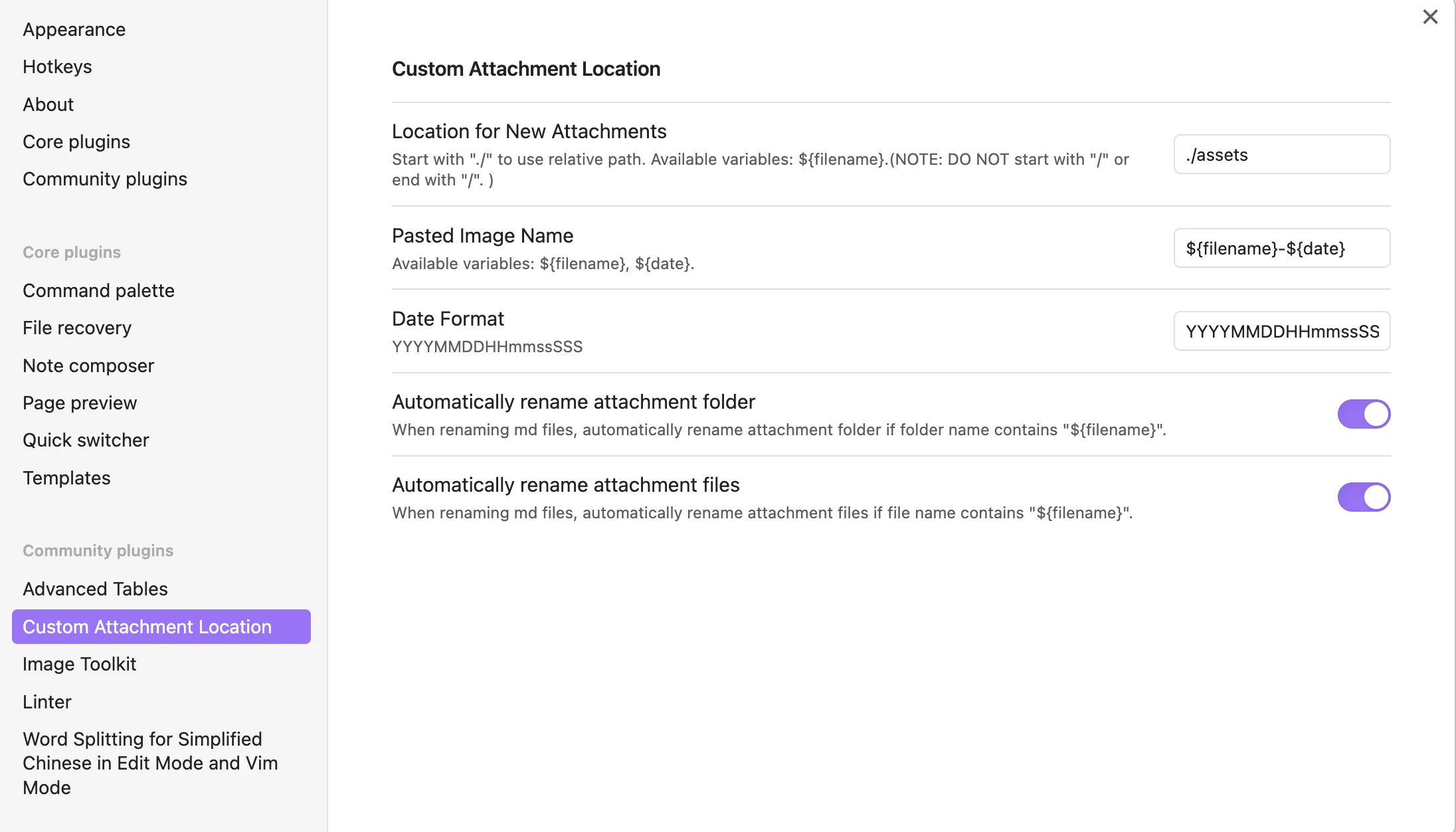 对于 Custom Attachment Location,设置如下。此时会将资源文件自动重命名,并保存到同层目录的 assets 文件夹。